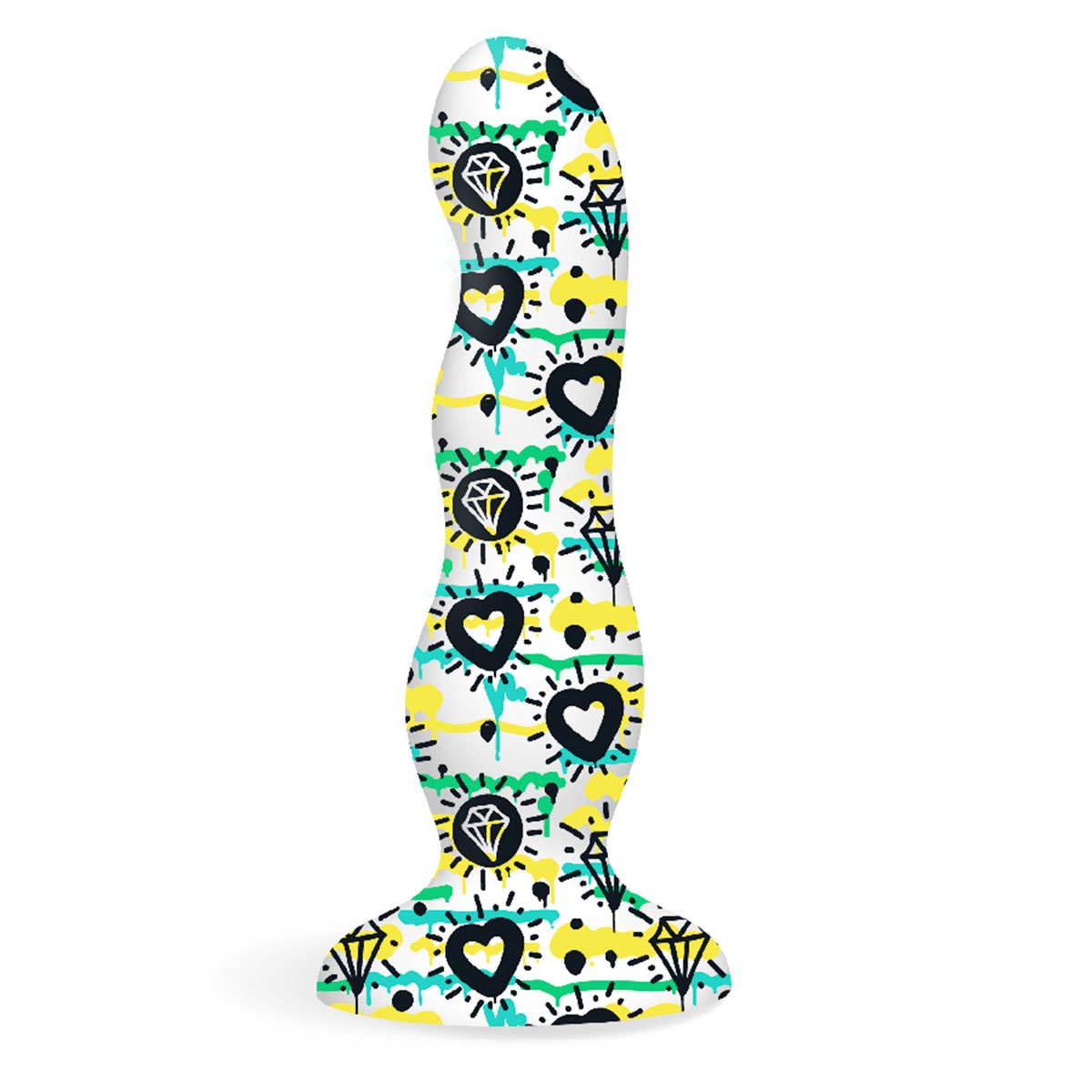 <p>Introducing the most beautiful silicone known to toys, Collage, with eye-popping designs tattooed right onto the silicone. Soft and silky and just the right size, theyre colorful, whimsical, elegant and stunning. </p><p>Diamonds and Hearts Curvy is totally on trend with with the graffiti youth culture. It’s perfect for "skater chicks" with it’s scatter-print of hearts and diamonds, surrounded by bold neon yellow, greens and blues, and fashionable "dripping" paint. </p><p>Each Collage features an ultra-grip suction cup for hands-free use or fun harness-play. Each quickly warms to your touch, are non-porous and easy to clean with gentle soap and warm water. </p><p>Diamonds and Hearts Curvy is gracefully curved, resolving to a round top that leans in for g-spot stimulation. Packaged in eye-popping colors, Collage is surely a treat for the sensesall of them! Enjoy Collage with or without lubricant, but always use a water-based, alcohol-free lubricant. And again use only gentle soap and warm water to clean, for years of edgy love.</p>